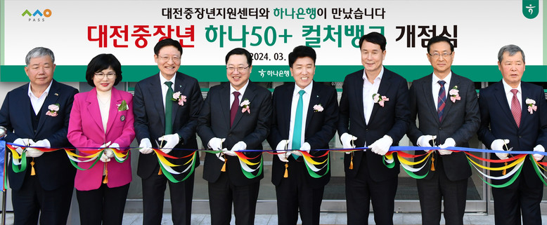 이날 「하나 50+ 컬처뱅크」 개점식 행사에는 이장우 대전시장과 이상래 대전시의장, 민경배 대전시의원을 비롯해 함영주 하나금융그룹 회장과 이승열 하나은행장, 임영진 성심당 대표이사 등이 참석해 이번 「하나 50+ 컬처뱅크」 개점을 축하했다.