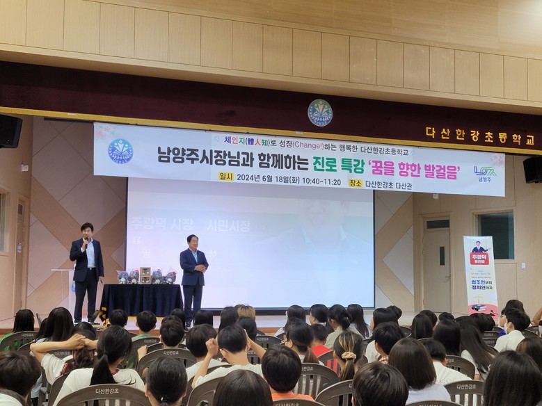 이날 강사인 주광덕 남양주시장은 「꿈과 희망을 공유하는 시간」이라는 주제 아래 다산한강초 학생들의 꿈에 대한 질문, 꿈을 이루기 위해 마음속에 희망의 씨앗 심기의 중요성, 호기심 많던 학생이 법조인을 거쳐 남양주시장이 되기까지의 여정 등으로 초등학교 6학년 학생들의 눈높이에 맞는 경험 중심의 흥미로운 이야기로 특강을 진행하였다. 특히 중간중간 퀴즈를 내어 학생들의 관심을 이끌며 학생들과 함께 호흡하는 생동감 넘치는 강의가 인상적이었다.