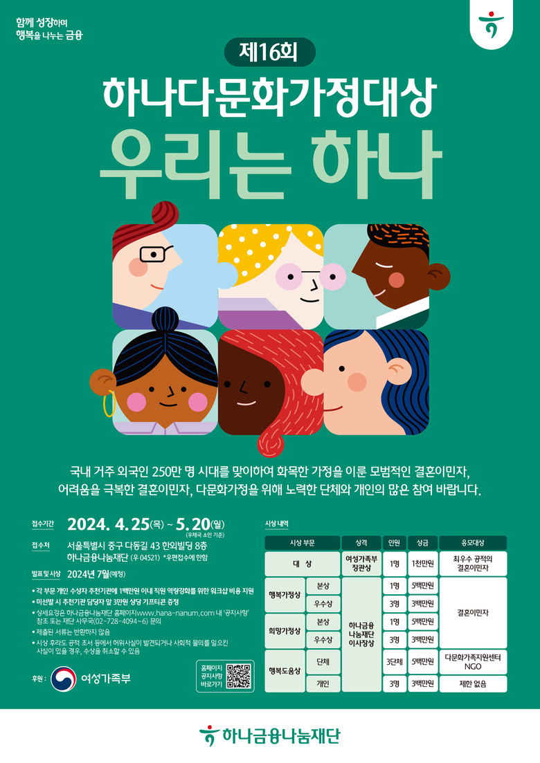 『제16회 하나다문화가정대상』 공모에 대한 자세한 내용은 하나금융나눔재단 홈페이지에서 확인 가능하다.