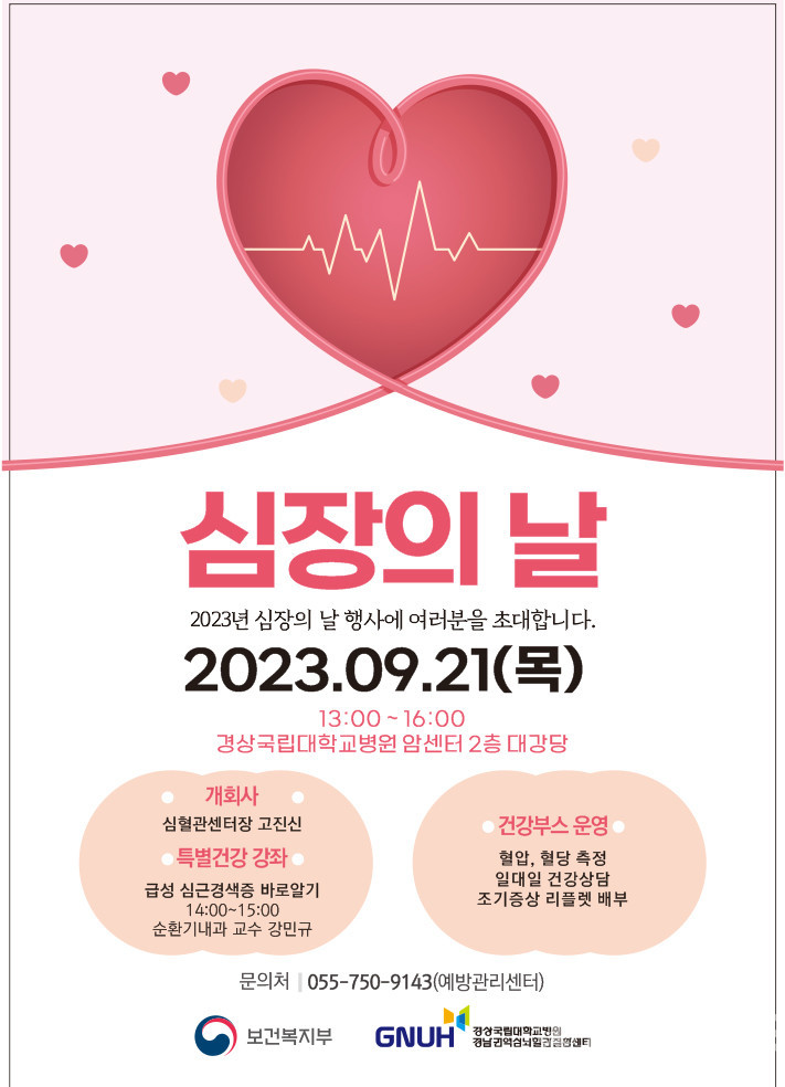 [세계타임즈 = 이판석 기자] 경상국립대학교병원(병원장 안성기) 권역심뇌혈관질환센터(센터장 최대섭)가 오는 21일 14시부터 경남지역암센터 2층 대강당에서 ‘세계 심장의 날’을 맞아 특별 건강강좌를 개최한다고 18일 오전 밝혔다.