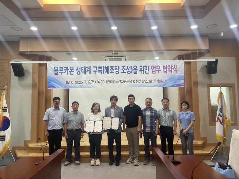 [강원도 세계타임즈=김민석 기자] 강원특별자치도 한해성수산자원센터(소장 임순형)는 7월 17일(목), 해조 생육 블록 특허 보유 업체인 동성해양개발㈜와 블루카본(blue carbon) 생태계 구축을 위한 업무협약(MOU)을 체결했다고 밝혔다.