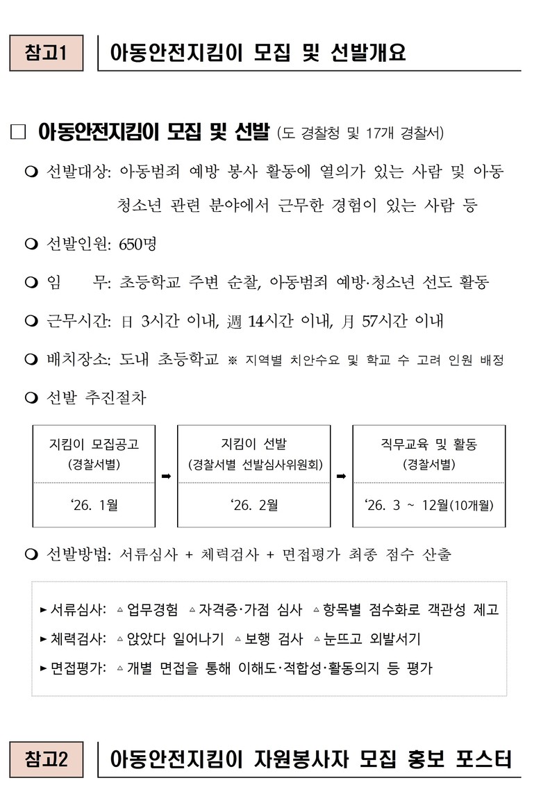 도내 각 경찰서는 아동안전지킴이 선발을 위해 범죄경력 확인, 체력 심사, 면접 등 객관적인 평가 절차를 거쳐 업무 이해도와 활동 의지, 치안 보조 활동의 적정성을 종합적으로 심사해 공정하게 선발할 예정이며, 선발 결과는 개별 통보된다.