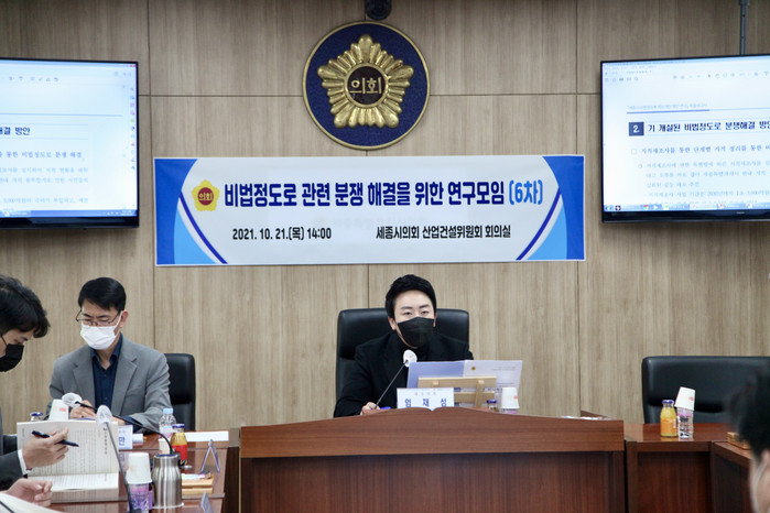 [세종=세계타임즈 이채봉 기자] 세종특별자치시의회 ‘비법정도로 관련 분쟁 해결을 위한 연구모임(대표의원 임채성)’은 21일 산업건설위원회 회의실에서 6차 회의를 개최했다.