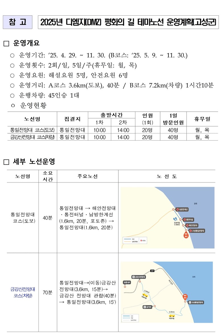윤광순 강원특별자치도 접경지역과장은 “고성 디엠지(DMZ) 평화의 길 테마노선 B코스는 남북관계 경색으로 2023년에 개방이 중단됐으나, 올해 3년 만에 다시 문을 열게 됐다”며, “올해 도내 6개 테마노선이 전면 개방됨에 따라 접경지역 안보관광이 한층 활성화될 것으로 기대한다”고 밝혔다.