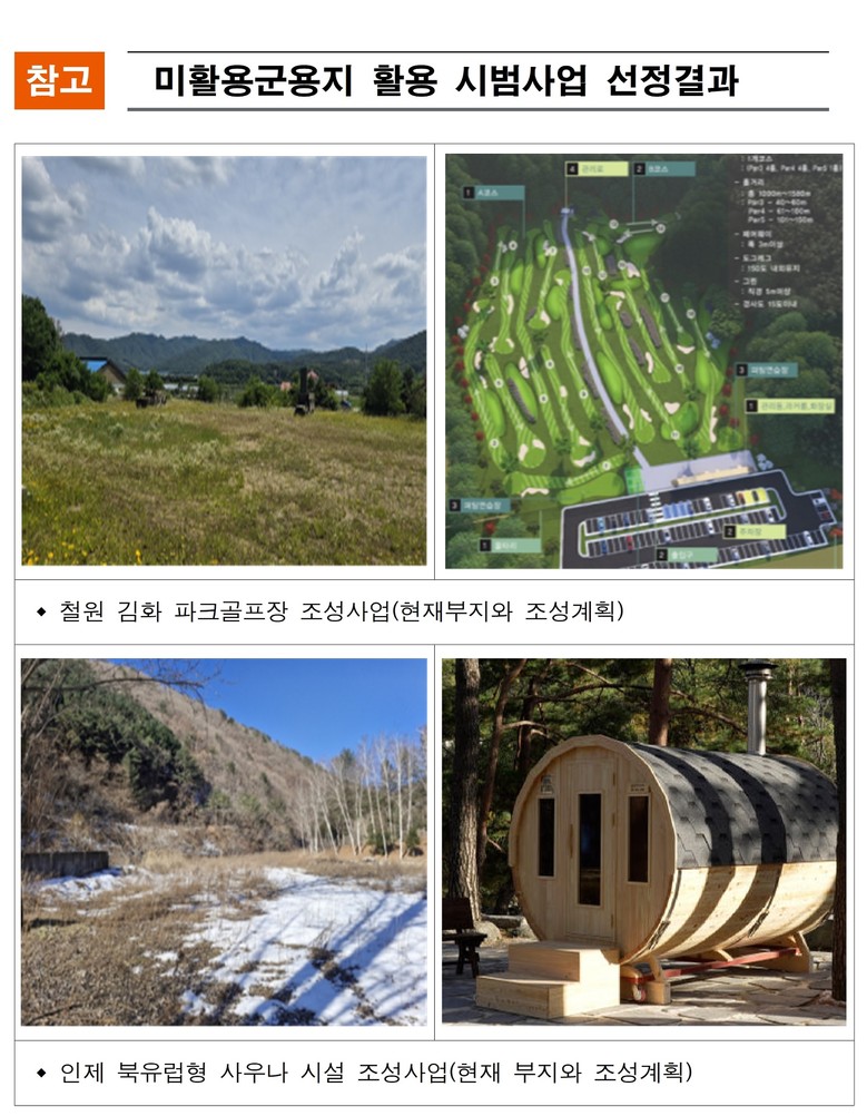 - 생활체육시설 조성 및 휴양 관광자원 구축으로 지역 활성화 기대 [강원도 세계타임즈=김민석 기자] 강원특별자치도(도지사 김진태, 이하 ‘도’)는 2025년 미활용 군용지 활용 시범사업에 철원군 김화 파크골프장 조성 사업과 인제군 북유럽형 사우나 시설 조성 사업 두 곳을 선정했다고 밝혔다.
