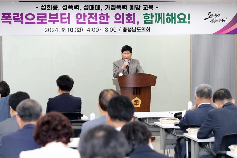 [충남 세계타임즈=백택기 기자] 충남도의회(의장 홍성현)는 10일 충남도의회 회의실에서 도의원과 공무원을 대상으로 성희롱·성매매·성폭력·가정폭력 등 4대 폭력 예방 교육을 실시했다.