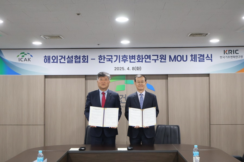 [강원도 세계타임즈=김민석 기자] 한국기후변화연구원(이사장 김진태)은 4월 8일(화), 해외건설협회(회장 한만희)와 글로벌 기후변화 대응 및 국가 탄소중립 달성에 기여하기 위한 업무협약을 체결했다고 밝혔다.