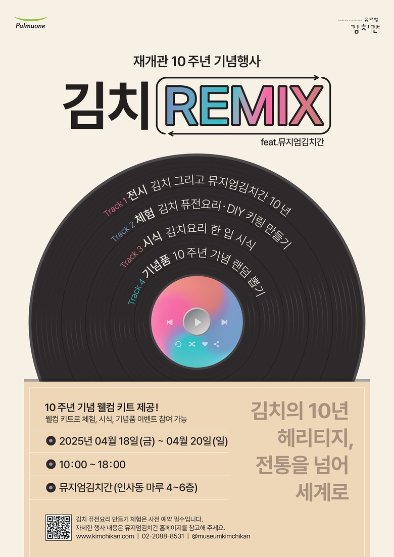 또한 행사 기간에는 박물관 무료입장이 가능하며, 풀무원 샘물 500ml와 관람객 체험 참여를 돕는 웰컴 키트도 제공한다. 웰컴 키트는 행사 안내 카드, 김치 꾸미기 스티커, LP판 모양의 굿즈 등으로 구성됐다. 각 코너에서 직원에게 행사 안내 카드를 제시하면 프로그램 체험, 시식, 기념품 랜덤 뽑기 등 다채로운 이벤트를 즐길 수 있다.