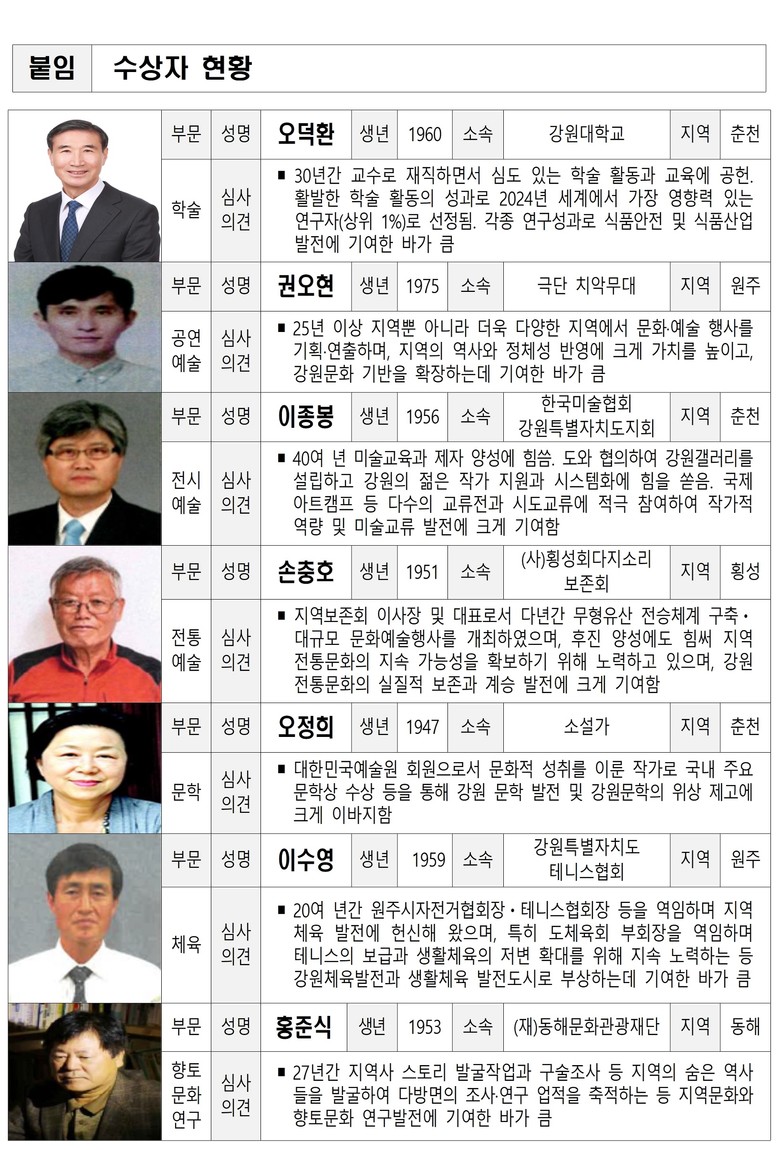 여중협 강원특별자치도 행정부지사는 “오랜 전통을 지닌 강원특별자치도 문화상을 통해 지역 문화 진흥을 위해 애써온 도내 문화예술인들을 예우하는 것은 물론, 강원 예술인들이 자긍심을 고취하고 역량을 강화할 수 있도록 적극 지원해 나가겠다”고 밝혔다.