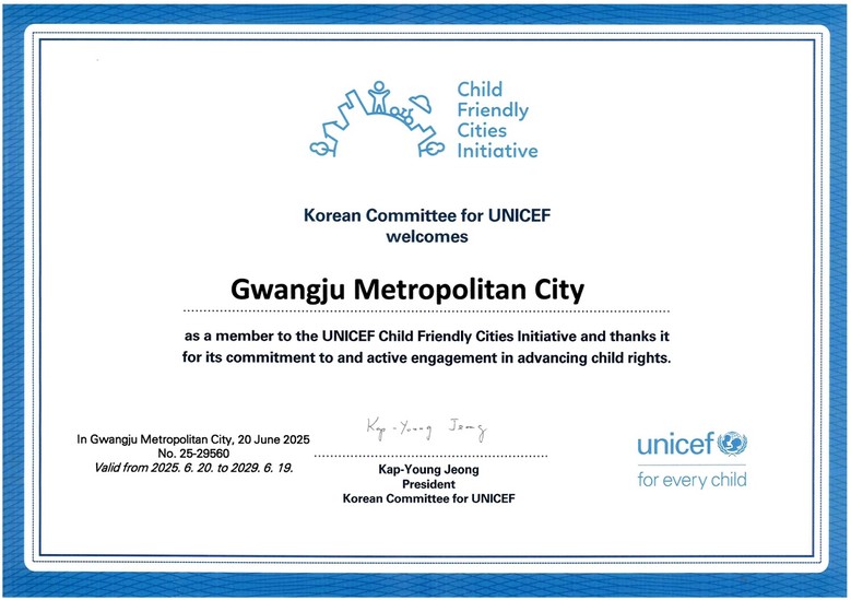 광주광역시(시장 강기정)는 최근(지난 20일) 유니세프 한국위원회로부터 ‘아동친화도시 상위인증’을 획득했다.