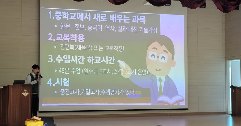 가림초 6학년 학생들은 중학교에서는 수업시간마다 선생님이 바뀌어 들어오는지 등 기초적인 질문부터 지필, 수행평가 등 성적에 대한 궁금증, 동아리활동 및 체험학습, 체육대회에 대한 궁금증까지 각자 자신이 관심 있는 분야에 대해 적극적으로 질문하며 관심을 보였으며 밴드, 댄스 공연도 함께 즐겼다.