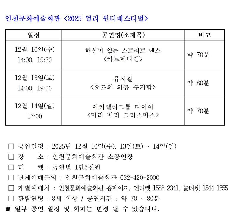 홍순미 시 문화예술회관장은 “이번 페스티벌은 장르의 경계를 넘어 예술의 문턱을 낮추고, 관객의 예술적 감수성을 확장하는 기회”라며, “스마트폰과 온라인 매체에서 벗어나, 오직 공연장에서만 느낄 수 있는 생생한 감동을 친구, 가족과 함께 경험해 보길 바란다”라고 말했다.