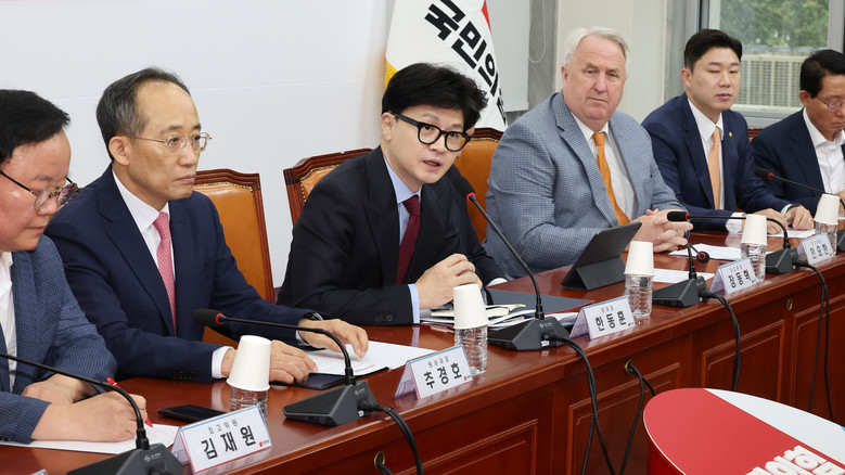 국민의힘 한동훈 대표(왼쪽 세번째)가 2일 오전 국회에서 열린 최고위원회의에서 발언하고 있다. 2024.9.2