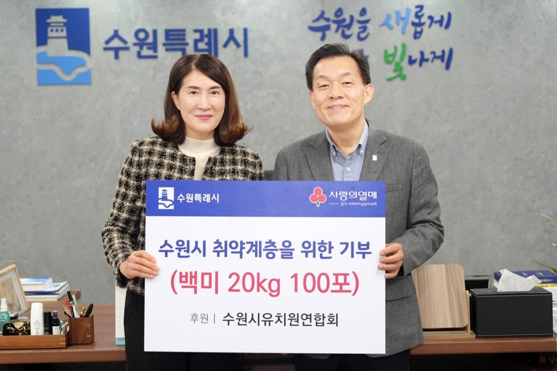 [수원시 세계타임즈=송민수 기자] 수원시유치원연합회가 “도움이 필요한 취약계층 이웃에 전달해 달라”며 수원특례시에 백미(20kg) 100포를 기부했다.