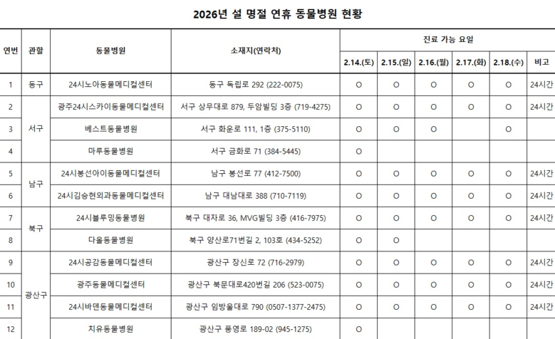 설 연휴 기간 응급진료를 운영하는 동물병원 정보는 120콜센터(062-120)와 광주시 누리집(https://www.gwangju.go.kr), 농림축산식품부 누리집(https://www.mafra.go.kr)에서 확인할 수 있다.