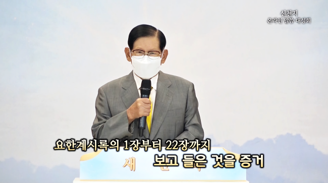 (사진=신천지예수교회 이만희 총회장이 지난 25일 열린 제 2차 신천지 온라인 말씀대성회에서 '주 재림과 세상끝'에 대해 설교하고 있는 모습)