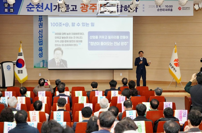 [광주 세계타임즈=손권일 기자] 광주광역시(시장 강기정)는 4일 국립순천대학교 파루홀에서 ‘광주‧전남 통합 순천시 상생토크’를 열고, 전남광주통합특별시 출범에 따른 순천 등 전남 동부권 산업발전 방안을 지역민들과 공유했다.