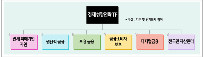 하나금융그룹은 대내외 경제 불확실성 증대로 인한 구조적 저성장 위기를 극복하고 국가의 새로운 미래성장 동력 확보에 기여하고자 은행ㆍ증권ㆍ카드ㆍ캐피탈ㆍ보험ㆍ자산운용ㆍVC 등 전(全) 관계사가 참여하는 ‘경제성장전략 TF’를 구축하여 ▲관세피해기업 지원 ▲생산적 금융 ▲포용금융 ▲금융소비자보호 ▲디지털금융 주도 ▲전국민 자산관리 지원 등 6개 분야에서 전사적 실행계획을 수립했다.