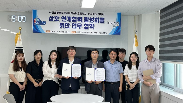 [아산시 세계타임즈=백택기 기자] 지난 9월 19일, 아산스마트팩토리마이스터고(교장 조동헌, 이하 스마트고)와 인지어스코리아(대표 잭 소이어)는 상호 연계협력 활성화를 위한 업무협약을 체결했다.