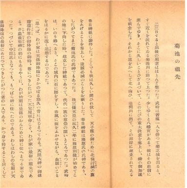 위 본문 내용을 보면 춘일신사(春日神社)에서 국지씨(菊池氏)와 후지와라씨(藤原氏)가 참배를 한다고 나와 있는데 여기서 춘일씨는 국지씨와 후지와라씨의 조상이며 춘일신사는 그 조상신을 모셔 놓은 곳이다.