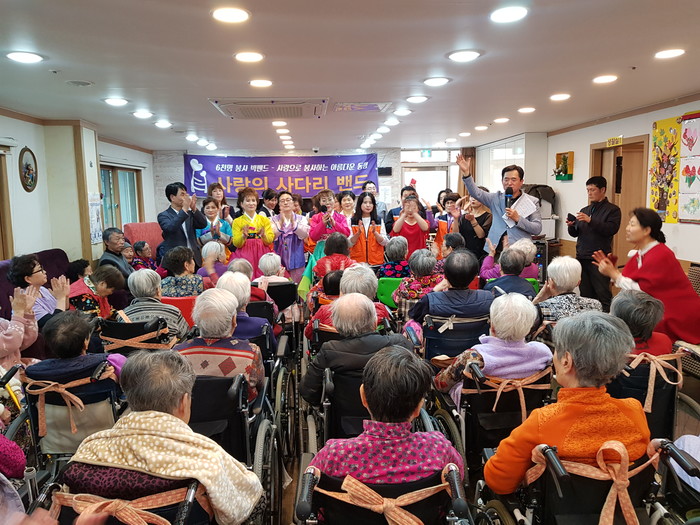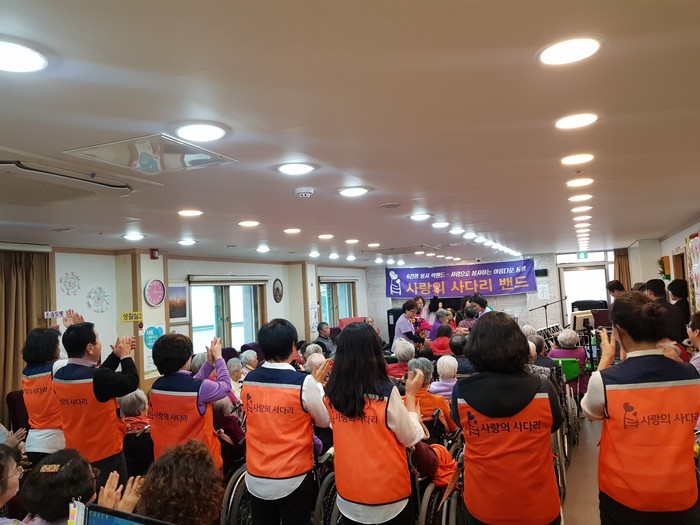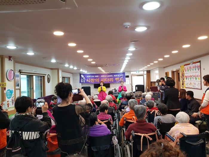 [세계타임즈 이장성 기자] 다양한 봉사를 꾸준히 하고 있는 대전시 SNS 봉사단체 사다리 밴드(리더 이정제)는 23일 오후2시, 대덕구 비래동에 위치한 예사랑실버케요양원(원장 김숙희)에서 치매어르신 60명에게 위문공연 봉사로 사회적 효행을 실천하였다.