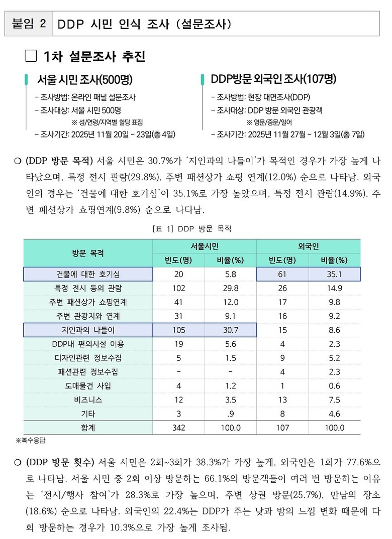 먼저 서울디자인재단이 지난해 서울시민 500명과 외국인 107명을 대상으로 한 조사 결과 서울시민 응답자 중 68.4%(342명)가 DDP 방문 경험이 있다고 답했고 45.2%는 두 번 이상 DDP를 찾았다고 밝혔다.