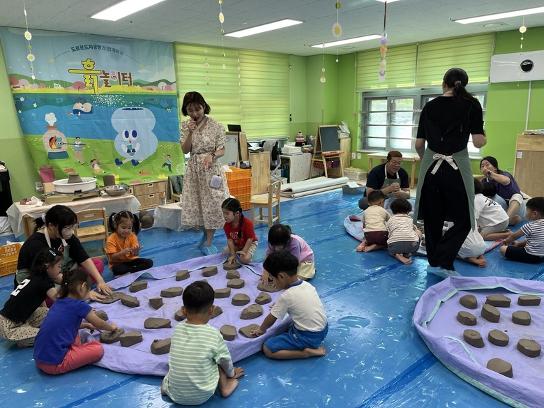 통합교육 프로그램 중 하나로 다양한 오감놀이를 실시하여 모두 함께 즐기며 나눌 수 있는 기회를 제공하고 있으며 특히 7월 중에는 만 3, 4세는 물레체험과 흙놀이, 만5세는 핸드페인팅으로 도자기에 그림을 그리는 흙놀이를 실시하였다.
