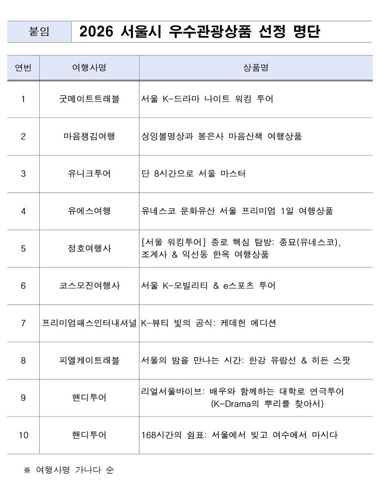 - 지난 3월 26일, ‘2026 서울 우수관광상품 운영사 얼라이언스 발대식’ 개최 [서울 세계타임즈=이장성 기자] 서울시와 서울관광재단(대표이사 길기연)은 ‘2026 서울시 우수관광상품 공모전’을 통해, 서울의 다양한 매력을 담은 우수 관광상품 9개와 서울-여수 연계상품 1개를 포함해 총 10개 상품을 최종 선정했다.