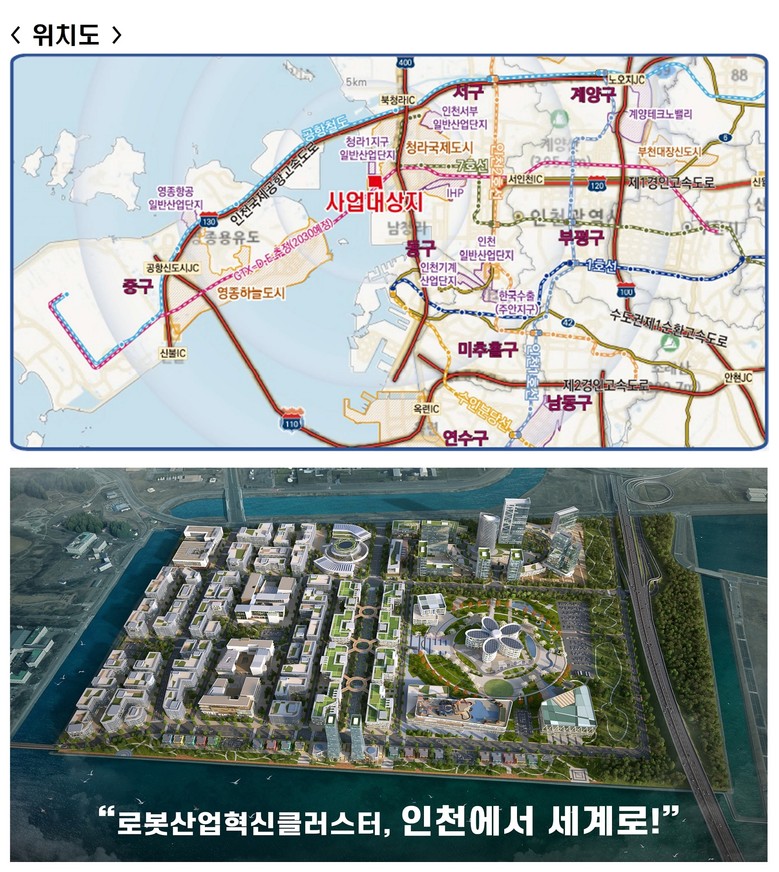인천로봇랜드는 인천경제자유구역 청라국제도시 내 76만 9천㎡ 부지에 로봇산업진흥시설과 테마파크, 상업 및 업무시설 등을 조성하는 대규모 프로젝트이다. 사업이 완료되면 400여 개 로봇기업 및 실증・연구기관이 집적하고 수도권 최대 규모의 로봇 실증 인프라, 실외 자율주행 테스트베드 구축이 추진되어 로봇산업의 全 단계(R&D–생산–실증–체험–사업화)를 하나의 공간에서 구현할 수 있는 산업기반을 갖추게 된다.