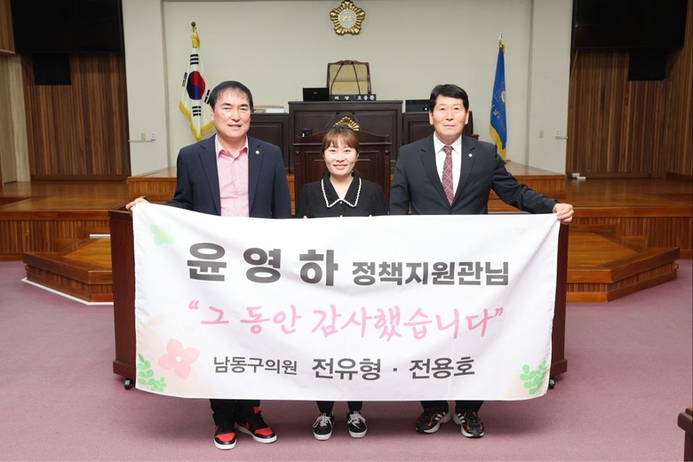 [남동구 세계타임즈=심하린 기자] 남동구의회 전유형‧전용호(국민의힘) 두 의원은 지난 6월 26일자로 남동구의회에서 정책지원관으로 근무하며 퇴직하는 담당 윤영하 정책지원관에게 감사패를 수여했다.