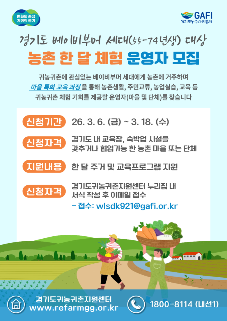 최창수 경기도농수산진흥원장은 “베이비부머 세대가 막연한 귀농·귀촌이 아닌, 충분한 체험과 준비 과정을 거쳐 안정적으로 정착할 수 있도록 지원하겠다”며 “역량 있는 마을의 많은 참여를 기대한다”고 말했다.