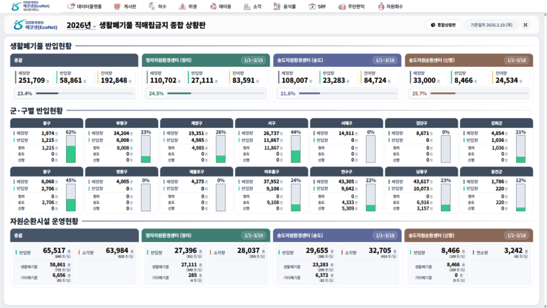 공단 전체의 환경정보데이터를 공개하고 있는 환경정보시스템 에코넷(EcoNet)을 기반으로 하여, 운영 데이터와 연계를 통해 청라, 송도, 신항 자원순환시설의 군·구별 생활폐기물 누적 반입량, 배정량 대비 반입 비율, 소각처리량 등 상세한 현황을 실시간으로 제공한다.