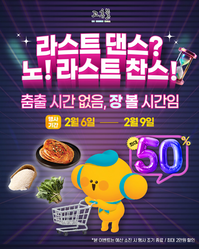 이번 기획전은 명절 직전까지 바쁜 일상으로 장보기에 여유가 없었던 소비자를 겨냥해 “라스트 댄스? 노! 라스트 찬스!_춤출 시간없음, 장 볼 시간임”이라는 유쾌한 콘셉트로 기획됐으며, 설 상차림에 필요한 고흥산 농수축특산물을 최대 50% 할인된 가격으로 선보인다.