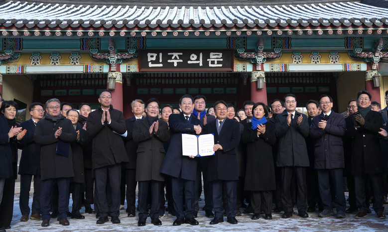 김영록 전남도지사와 강기정 광주시장은 이날 국립5·18민주묘지를 참배한 후 민주의 문 앞에서 광주시와 전남도를 통합한 ‘통합 지방정부’ 설치 추진을 위한 공동선언문을 발표했다.