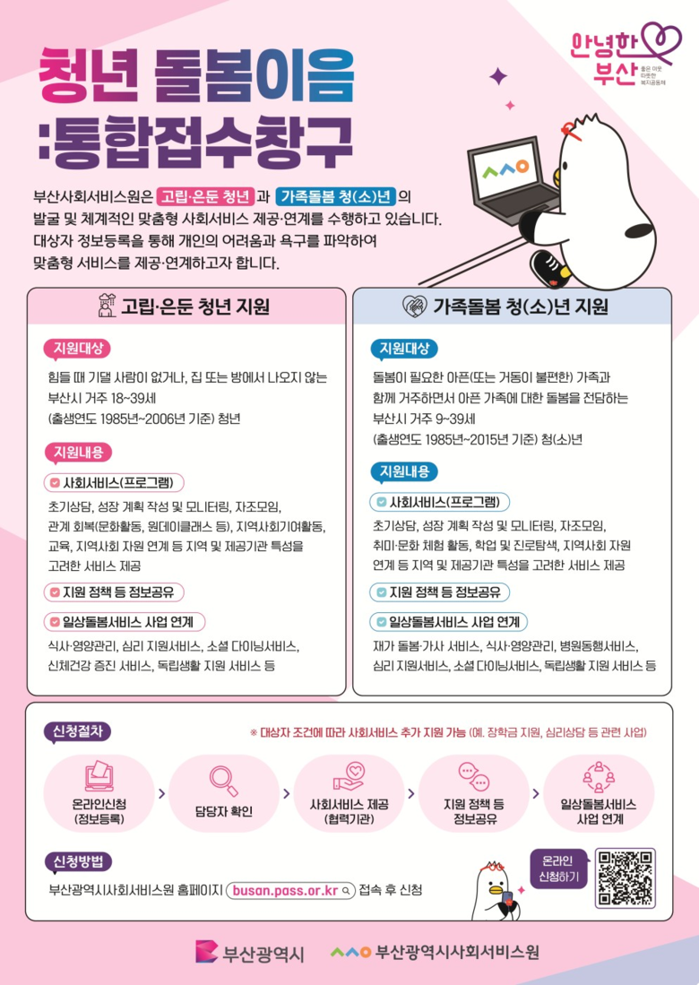 한편, 시는 사회서비스원과 함께 고립·은둔 청년과 가족돌봄 청(소)년을 발굴하고 체계적인 맞춤형 사회서비스를 제공·연계하는 '청년 돌봄이음사업' 통합접수창구를 상시 운영하고 있다.