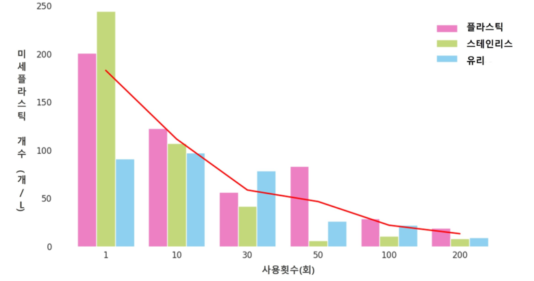 재질별로 미세플라스틱 평균 발생량은 1리터당 플라스틱이 120.7개로 가장 많았고 스테인리스 103.7개, 유리 69.2개 순이었다.