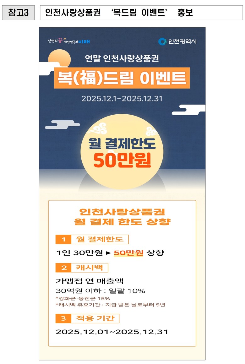 이 자리에서 유정복 시장은 “오늘부터 인천사랑상품권‘연말 복(福) 드림 이벤트*’가 시작된다”며, “결제 한도 상향(50만 원)으로 시민들의 캐시백 혜택이 증가하고, 이는 곧 소상공인의 매출 증대로 이어져 지역 경제가 살아나는 디딤돌 역할을 하기를 기대한다”라고 말했다. 또한 “지역 경제를 지켜주시는 소상공인 여러분께 감사드리며, 앞으로도 민생 경제의 뿌리인 여러분과 함께 어려움을 극복해 나가겠다”라고 강조했다.