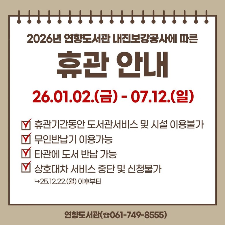 휴관 기간은 공사 일정에 따라 단축 또는 연장될 수 있으며 일정 변경 시 순천시립도서관 홈페이지를 통해 공지할 예정이다.