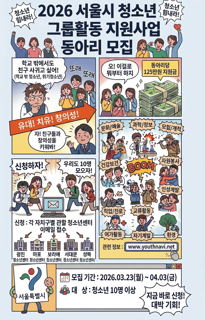 - 학교 밖 청소년 참여 동아리 우대, 최대 10점 가점… 포용적 참여 환경 조성 [서울 세계타임즈=이장성 기자] 서울시는 청소년이 스스로 기획하고 운영하는 동아리 활동을 지원하는 「2026년 청소년 그룹활동 지원사업」 참여 동아리 171개를 모집한다고 밝혔다. 청소년의 자율적이고 지속적인 활동 기반을 넓히려는 취지다. 신청은 3월 23일(월)부터 4월 3일(금)까지 자치구별 거점 청소년센터에서 접수한다.