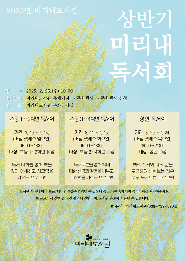 자세한 사항은 미리내도서관 홈페이지(lib.wonju.go.kr/mr)를 확인하거나 장서관리팀(☎033-737-3904)으로 문의하면 된다.