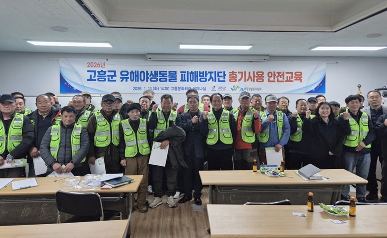 [고흥군 세계타임즈=우덕현 기자] 고흥군(군수 공영민)은 지난 13일 고흥문화회관 세미나실에서 2026년도 유해야생동물 피해방지단으로 선발된 수렵인 37명을 대상으로 ‘총기 사용 안전교육’을 실시했다고 밝혔다.