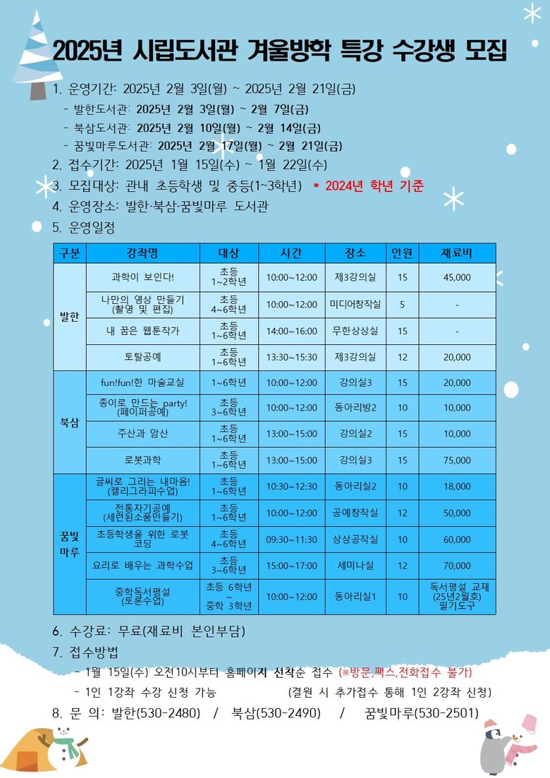 이번 특강은 겨울방학을 시작한 초등학생과 중학생을 대상으로 ▲ 발한도서관 2월 3일부터 2월 10일까지 ▲ 북삼도서관은 2월 10일부터 2월 14일까지 ▲ 꿈빛마루도서관은 2월 17일부터 2월 21일까지 ‘과학이 보인다!’, ‘주산과 암산’, ‘초등학생을 위한 로봇 코딩’ 등 총 13개 과정을 운영하며,
