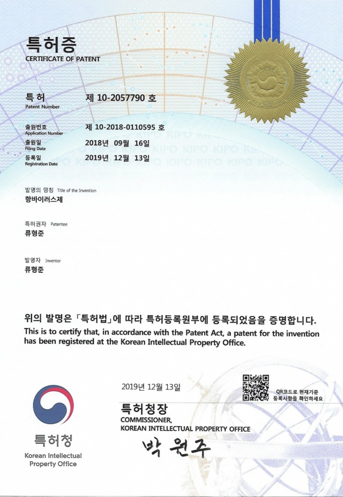 이번 제10-2057790호 특허는 항 바이러스제에 관한 것으로, 더 상세하게는 다양한 종류의 바이러스에 대하여 사멸 효과를 발휘하는 ‘광범위 항 바이러스제’이다. 특히나 유향, 몰약, 프로폴리스, 올리브잎 추출물 등 천연물 성분을 토대로 발명한 것에 큰 의미가 있으며, 약사가 받은 최초의 항 바이러스제 특허이다. 바이러스로 인한 질병 증상의 예방 또는 치유에 뛰어난 효과가 있음을 기나긴 연구 끝에 증명하였다.