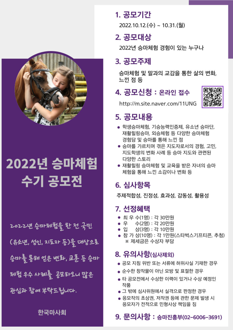 한편, 참여를 희망하는 사람은 10월 31일까지 QR코드를 이용하여 온라인으로 신청하면 된다. 공모방법, 유의사항 등 기타 자세한 사항은 한국마사회 말산업정보포털 호스피아 홈페이지에서 확인할 수 있다.