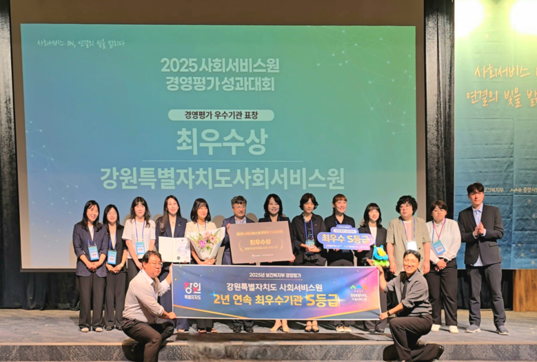 [강원도 세계타임즈=김민석 기자] 강원특별자치도 사회서비스원(원장 이은영, 이하 도 사회서비스원)은9월 9일(화) 보건복지부가 주최하고 중앙사회서비스원이 주관하는 ‘2025년 사회서비스원 경영평가 성과대회’에서 2년 연속 최우수 기관으로 선정되어 보건복지부 장관상을 수상했다.