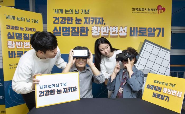 | ▲한국의료지원재단은 10월10일 ‘세계 눈의 날’을 맞아 8일, 종로노인종합복지관을 방문한 어르신들을 대상으로 ‘건강한 눈 지키자! 실명질환 황반변성 바로알기’캠페인을 진행하고 있다. 복지관을 찾은 어르신들이 황반변성 질환 체험존에서 VR기기를 이용해 질환을 간접 체험해보고 있다. 사진제공/한국의료지원재단 |