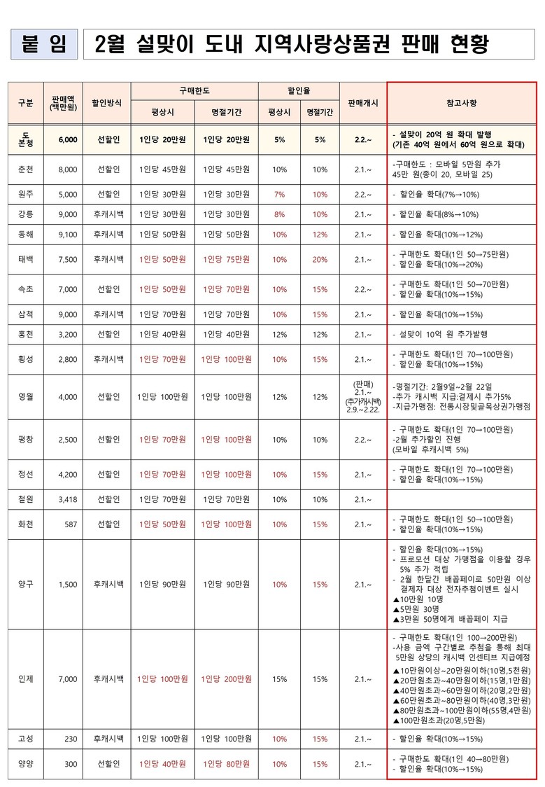 * 시군별 구매한도 및 할인율 상이(붙임 참고)
