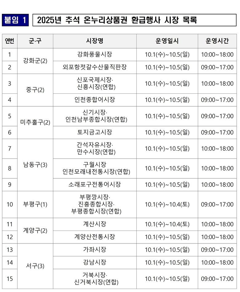 인천시는 올해 총 4회에 걸쳐 추진했으며, 11만 3천여 명의 시민들에게 약 19억 2천만 원 상당의 온누리상품권을 환급해 준 바 있다. 이번 추석 행사에서는 12억 9천만 원 상당의 온누리상품권이 선착순 지급되며, 예산 소진 시 조기 종료될 수 있다.