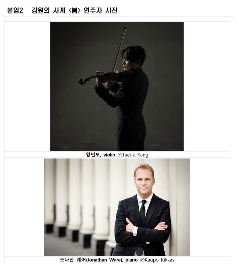 강원의 사계 ‘봄’ 양인모와 조나단 웨어 듀오 리사이틀의 티켓 오픈은 2월 5일(수) 오후 2시로 예정되어 있고, 음악제 홈페이지(mpyc.kr/tickets)와 인터파크 티켓(ticket.interpark.com)에서 판매를 시작한다.