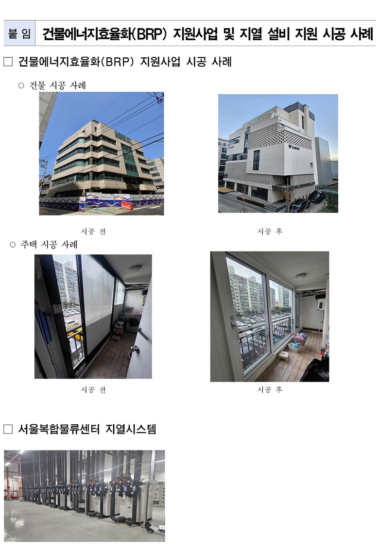 ※ 건물에너지효율화사업(Building Retrofit Project, BRP): 단열창호·단열재·고효율 조명 교체, 냉난방 및 공조 시스템 개선, 신재생에너지 설비 도입 등 지원